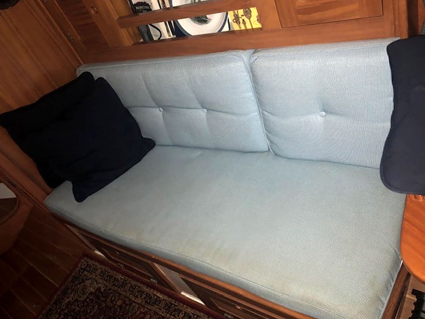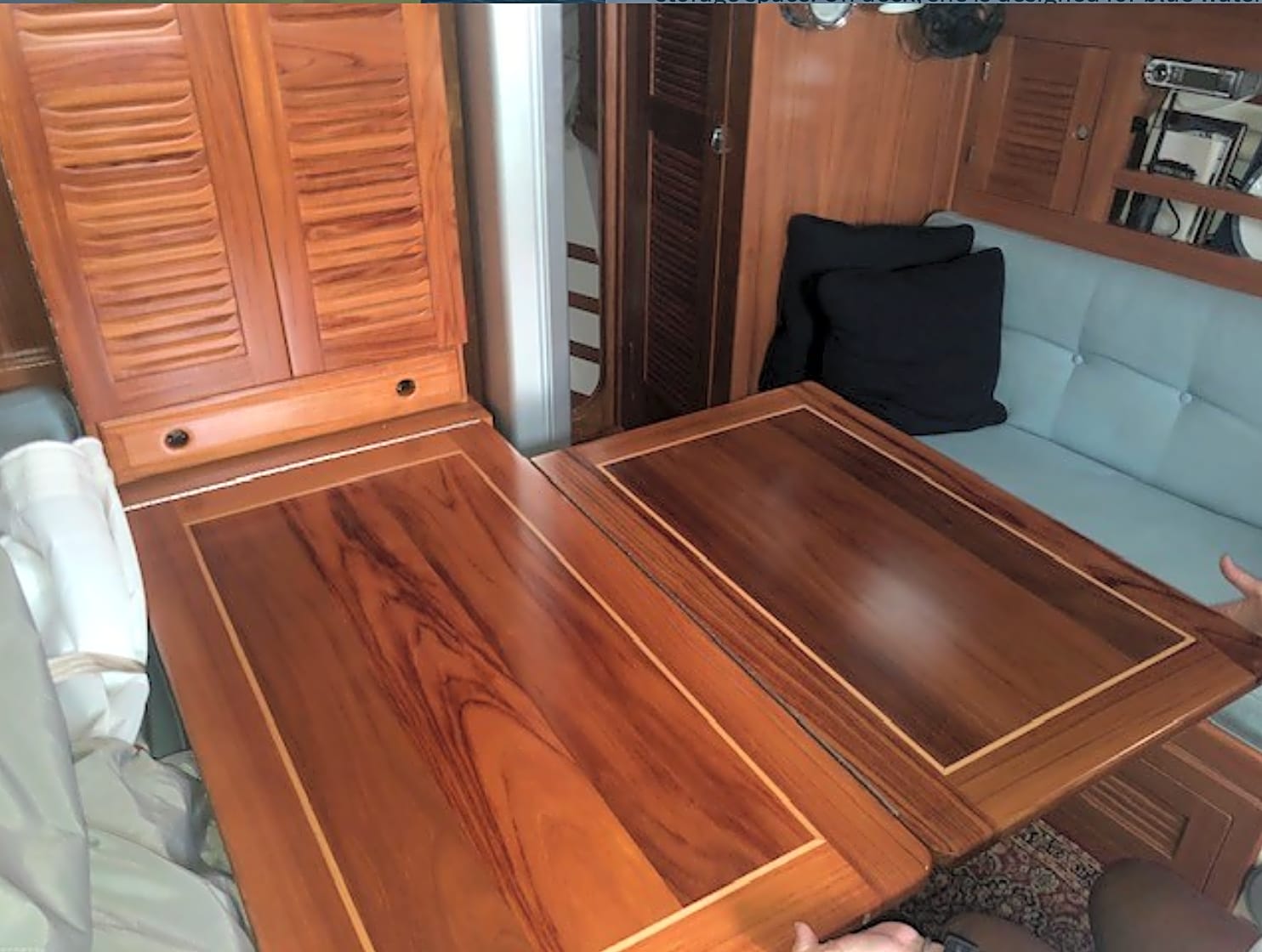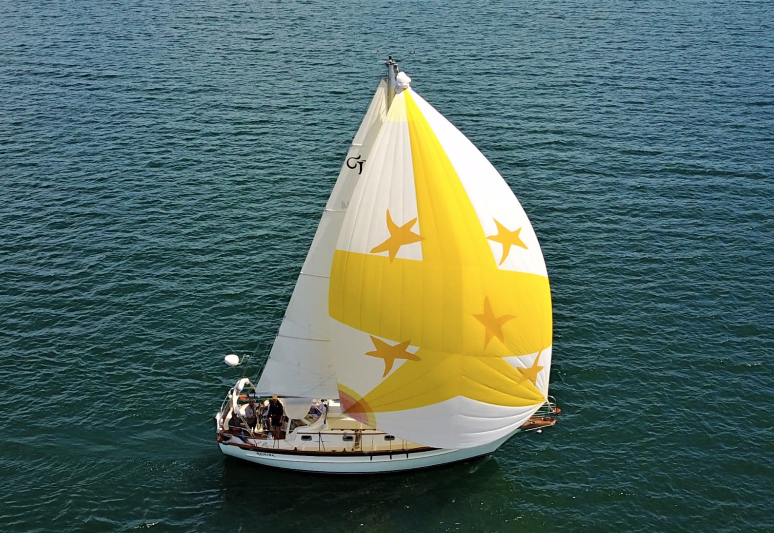 Arriba’s hull is constructed in solid fiberglass with a full keel and lead ballast. The hull is finished in off white gelcoat. Her deck is cored fiberglass.